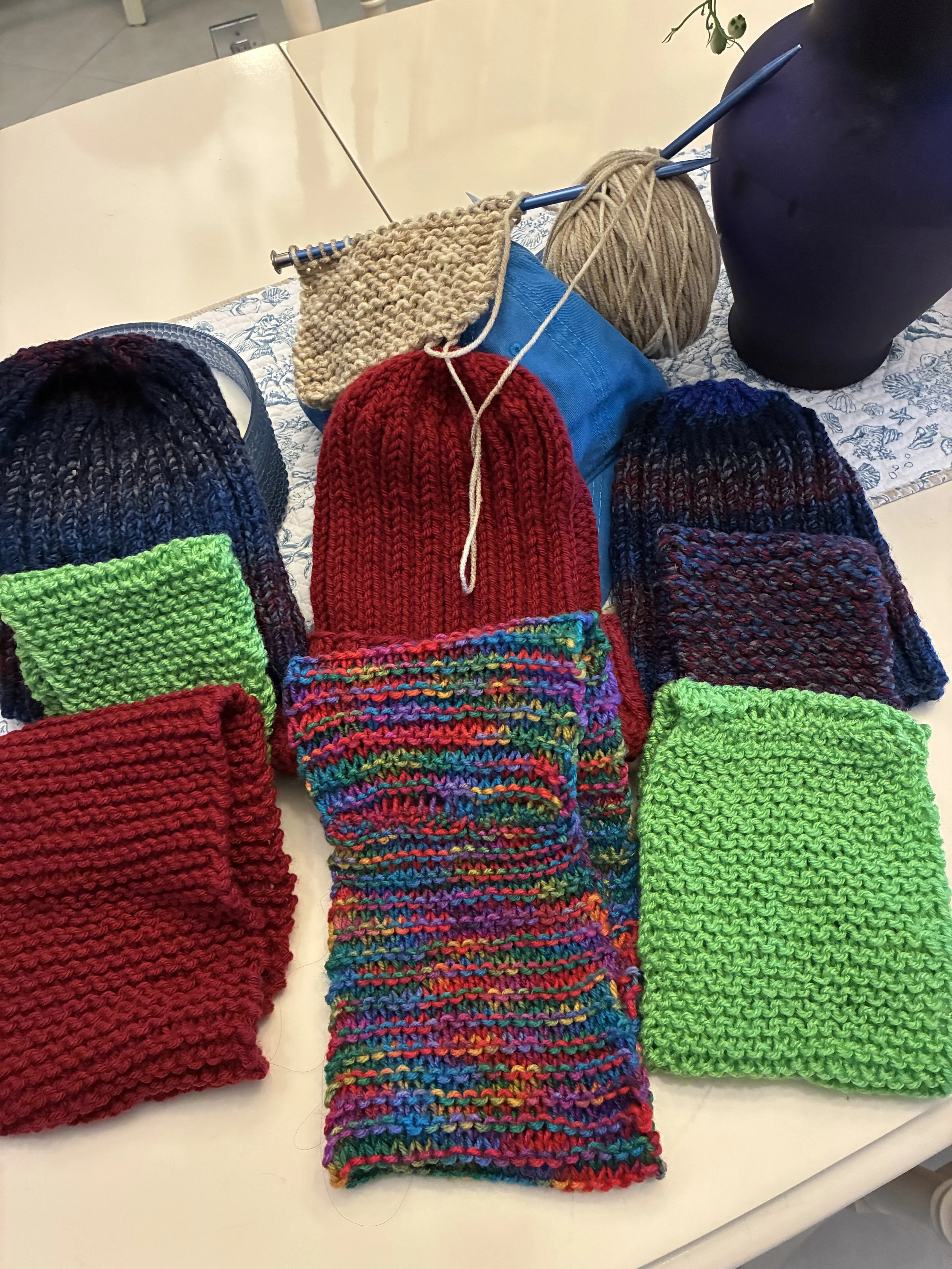 Lately, we have renewed a tradition begun by Pat Meech years ago, before she and Kevin moved to Iowa, that of knitting ear warmers and hats for our guests distributed during the cold streaks we seem to experience more frequently these days. It is so utterly heartwarming to see the expressions of appreciation on the faces of the recipients who are so grateful for a little something to warm them up, along with the hot coffee, soup, and occasional scarves people thoughtfully donate.